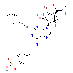 | SMILES | CNC(=O)[C@@]12C[C@@H]1[C@@H](n1cnc3c(NCCc4ccc(S(=O)(=O)O)cc4)nc(C#Cc4ccccc4)nc31)[C@H](O)[C@@H]2O |